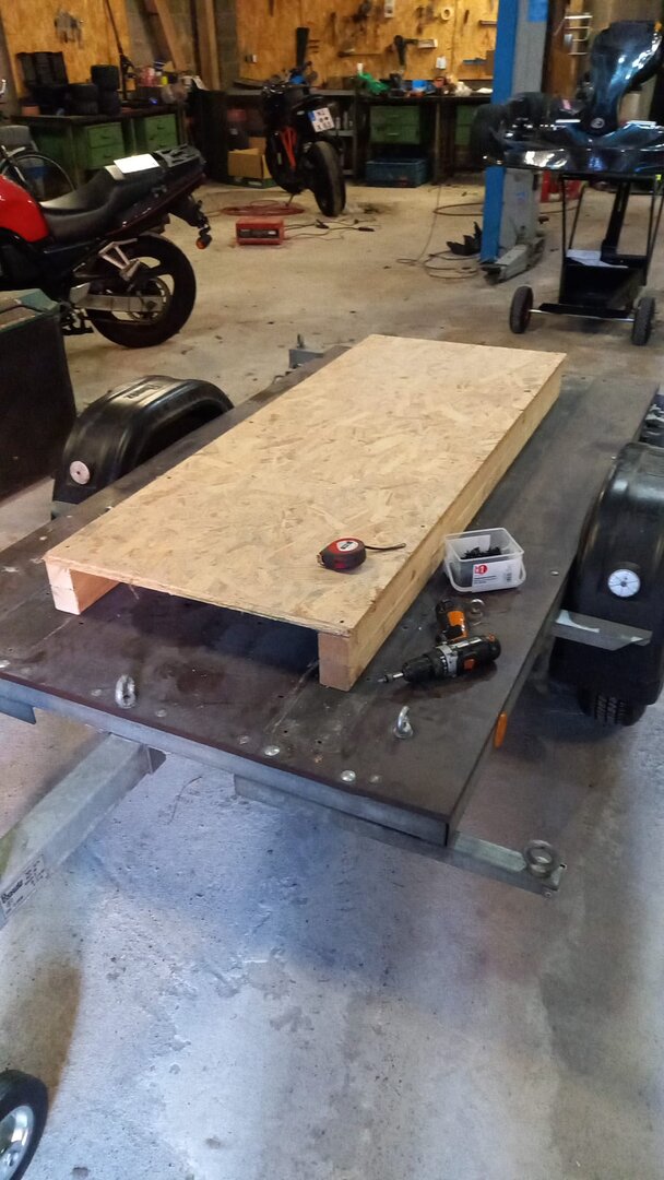 Schienen runter, 4 Balken + OSB Platte. Das Ganze nur mit ein paar Spax Schrauben befestigt, weil es eh vom Kart gehalten wird und ich es schnell abmontieren können möchte. 60er (? Standard halt) OSB Platte passt genau unter den Rahmen. Ziemlich low cost.