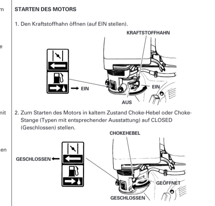 Zum Starten des kalten Motors den Choke-Hebel nach links schieben, dann ist die Choke-Klappe am Eingang des Vergasers geschlossen.