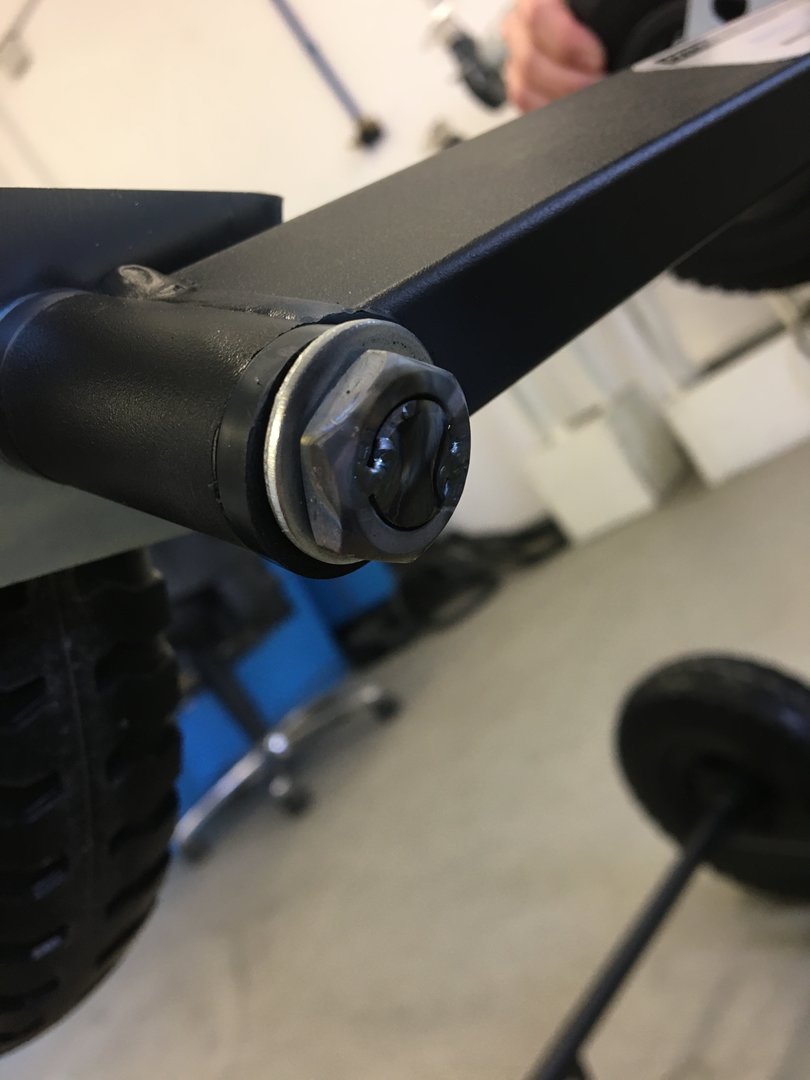auf den Bildern sieht man nun unsere Lösung. Wir haben das angeschweißte Rohr bündig abgeflext und den dazugehörigen Bolzen sowie Mutter ebenfalls gekürzt bzw. abgeschliffen. Damit sich die Mutter nicht aufdrehen kann ( falls doch mal ein Radwechsel nötig ist ) kurz mit zwei Schweißpunkten fixiert. Nun haben wir 3 cm gewonnen und können den Kartwagen ohne Probleme benutzen.