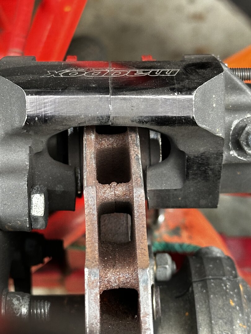 Linker Belag verschleißt deutlich mehr als der rechte Belag, Scheibe läuft zumindest optisch schräg in den Sattel. Kolben sind gängig und entlüftet wurde die Bremse ebenfalls.