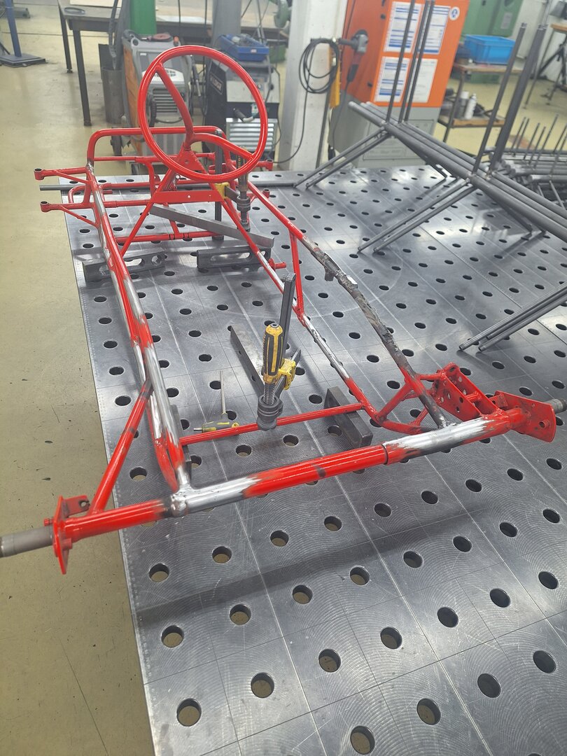 Weiter ging es nun nach dem ganzem Flex-und Schleifexzess mit den Richtarbeiten. Glücklicherweise verfüge ich über einen großen Schweißtisch, auf dem sich der Rahmen entsprechend fixieren und drücken lässt. Die Schweißtisch-Spanner erwiesen sich hierbei als super funktionierendes Richtwerkzeug. Obere und untere Rahmenrohre standen schief zueinander, geschuldet wohl auch den früheren, fehlenden Möglichkeiten bzw einer Rahmenlehre. Wurde ja alles nur frei Schnauze zusammen gefrickelt. Jedenfalls sind die Längsrohre "fahrerseits" wieder gerade und stehen ganz vernünftig übereinander. Auf der "Beifahrerseite" wird später noch etwas gerichtet, wenn der obere und untere Teilersatz der Rahmenrohre verschweißt ist.
