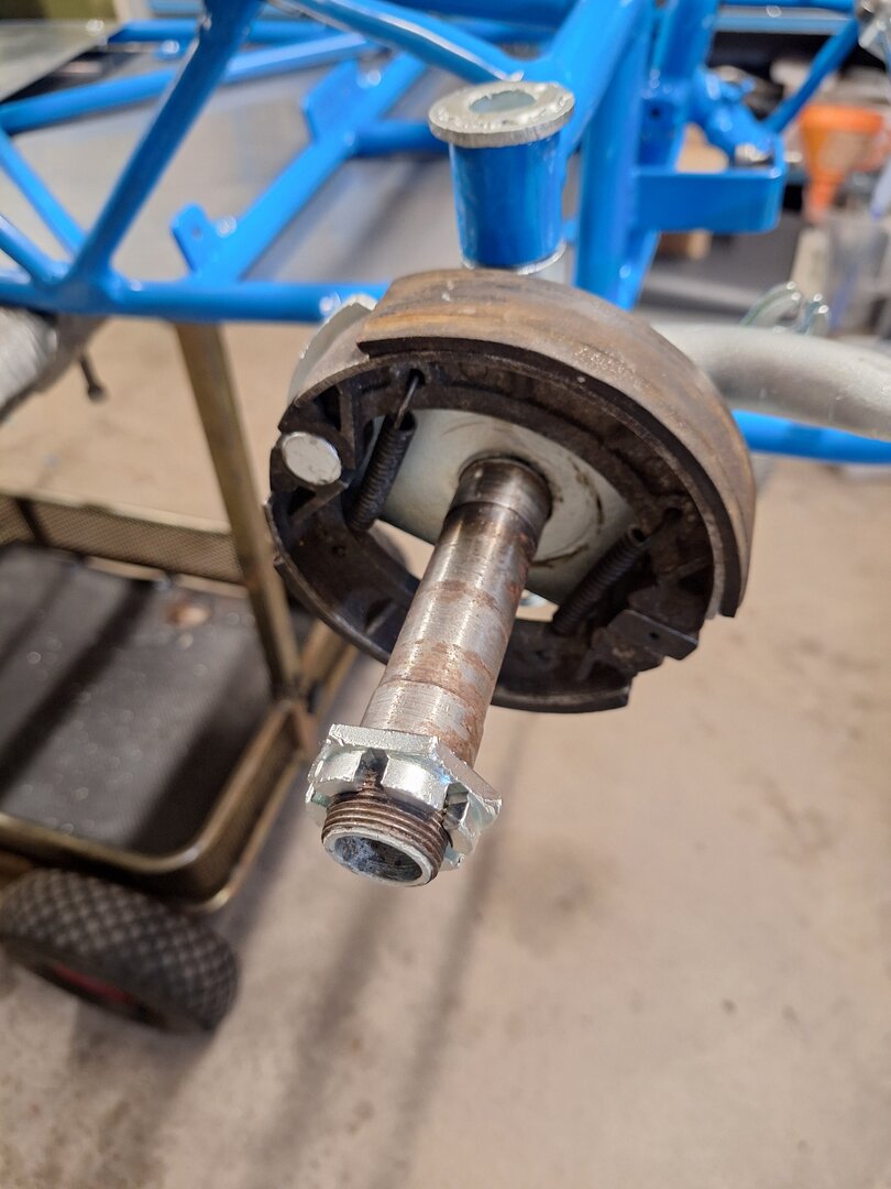 Und weiter ging es mit dem Zusammenbau. Pedalerie nach der Pulverbeschichtung gangbar gemacht. Lenkung komplettiert und eingestellt. Bremsnocken, Hebel und Beläge eingebaut.
