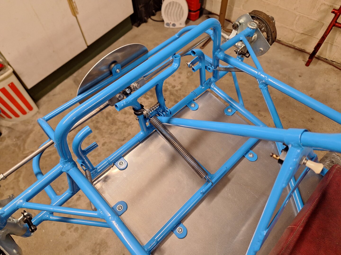 Leider geht's nicht so richtig vorwärts, die bestellten Sachen lassen auf sich warten. Lediglich paar Einstellschrauben für die Seilzüge lagen im Briefkasten. Also just die Gewindelöcher vom Pulver befreit,Einsteller verbaut und da das Bremspedal schon immer etwas entschleunigt zurück ging habe ich mir noch eine Federunterstützung ausgedacht. Die Adaption ans Pedal erfolgte über eine kleine Rohrschelle, an das Blech mit den Einstellschrauben kommt dann noch eine weitere Halterung ran, damit die Feder hoch genug ist und nicht mit den Seilzügen kollidiert. Weiter hab ich heute noch die hinteren Nummerntafeln angepasst und den Sitzbezug zur finalen Prüfung vorm Verkleben eingesetzt.