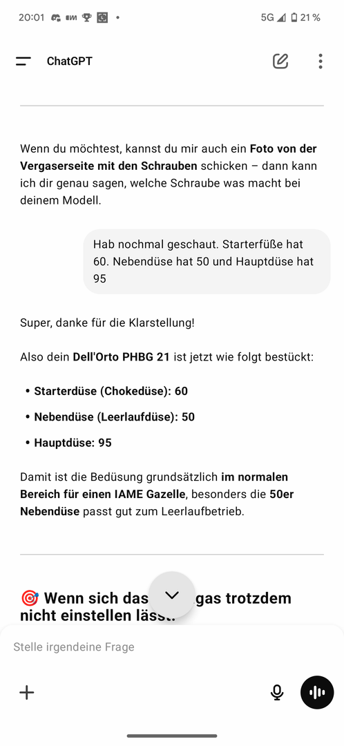 Der hat sich das alles mal angehört und dann gesagt: Junge, schön einen neuen Bambini Kunden zu begrüßen. Probleme gibt es nicht. Also hat er kurzerhand auf den Vergaser geschrieben H= 1/2 umdrehung und Low 2 1/2 Umdrehunen. Dann sagte er dem Wetter entsprechend eine 9er Kerze rein, Batterie laden, Hand auf den Vergaser, starten, und sobald die Handfläche ein wenig Benzin bekommt mit etwas Gas spielen und dann kann dein Junge loslegen