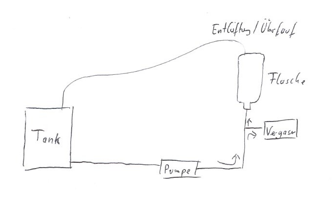 Ich habe mir überlegt folgenden Versuchsaufbau zu machen: Ich baue eine Flasche mit einem T-Stück in die Zuleitung des Vergasers. Die Flasche ist natürlich belüftet. Wenn die Pumpe genügend Sprit liefert, sollte sie parallel die Flasche füllen. Sollte die Pumpe in irgendwelchen Betriebszuständen nicht genug Sprit liefern, so würde der Vergaser aus Schwerkraft aus der Flasche bedient und die Flasche würde sich entleeren. Wenn die Flasche immer voll ist und sogar Sprit über den Überlauf zurück in den Tank fließt, liegt es schonmal nicht an der Pumpe oder am Unterdrucksystem.