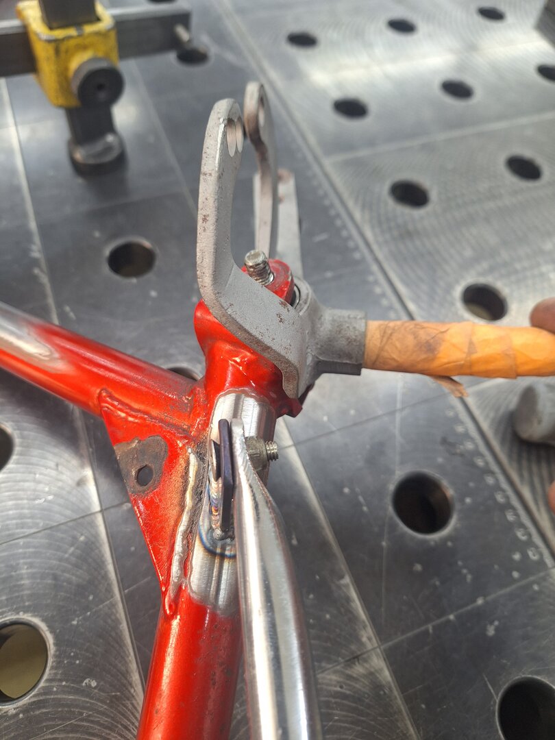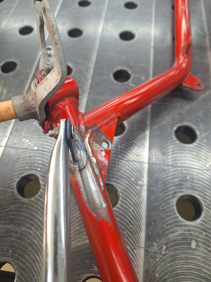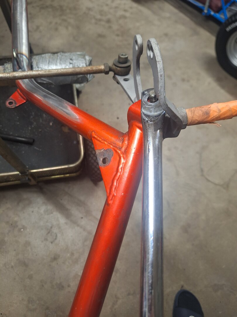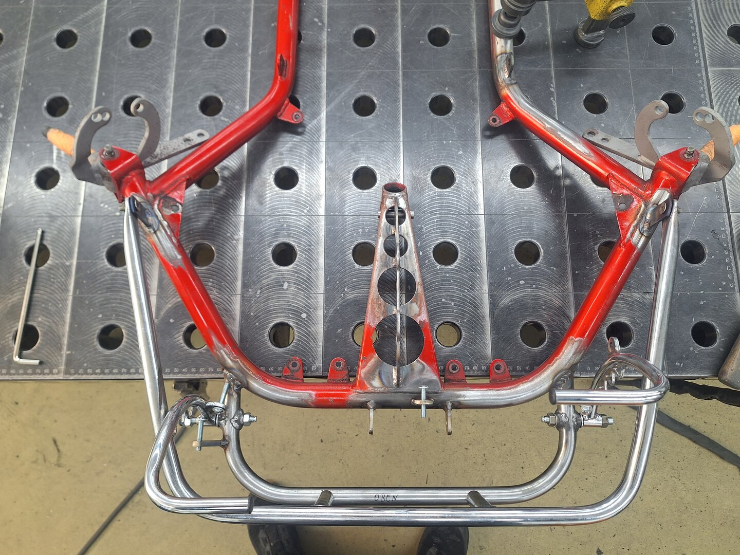 Parallel dazu habe ich den vorderen Stoßstangenbügel nochmal geändert. Dieser stammt aus dem MS Kart Regal und wird zusammen mit den Achsschenkelbolzen fixiert. Hatte schon anfangs meine Bedenken ob das alles so geht, da die Kali Bremshalter vorn schon ne recht spezielle Form haben. Natürlich war's so, das das die Achsschenkel an der Stoßstange anstießen. Also den Bügel gekürzt und neu abgesetzt. Zwei Haltelaschen lagen noch parat, die hatte ich am Auspuff abgetrennt. Bissel zurecht geschliffen und an den Rahmen geschweißt. Nix verschwenden, wieder verwenden... 😅