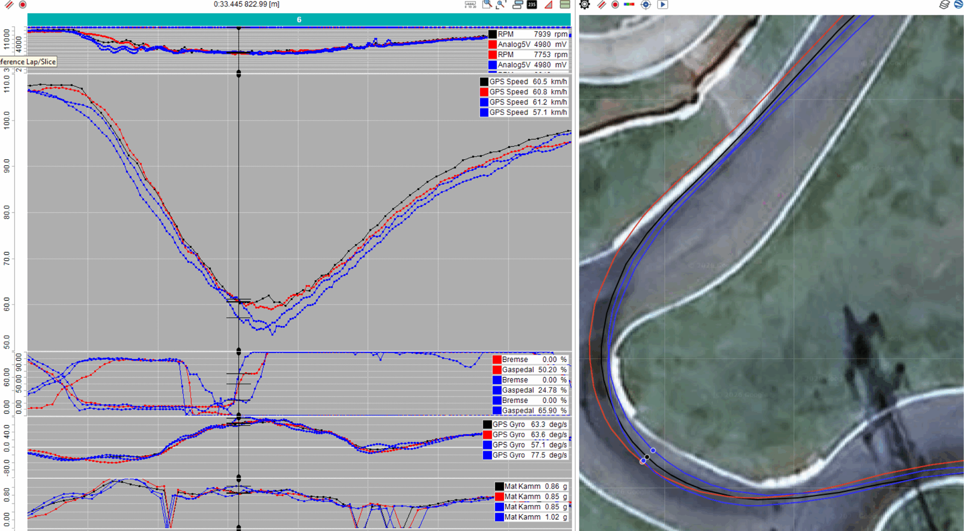 Wie gut dein Motor läuft, vergleiche auf der Geraden davor oder auf der Geraden zur Schikane. In meinem Beispiel sieht man dass der Motor vom blauen Fahrer sogar besser ist.