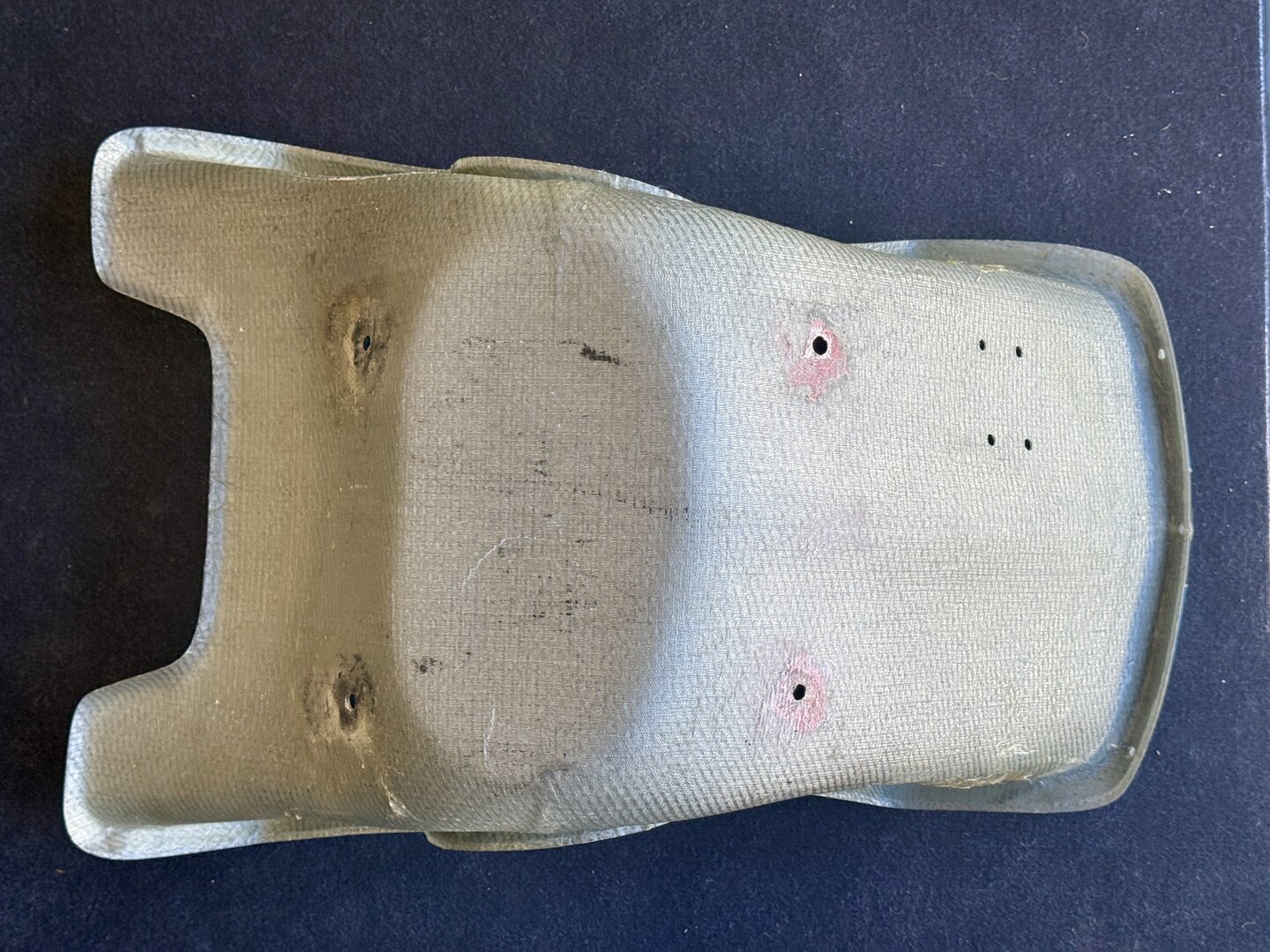 Es sind mehrere Löcher von vorherigen Befestigungspositionen vorhanden. Der Sitz wurde an belasteten Stellen bereits mit GFK verstärkt bzw. repariert.