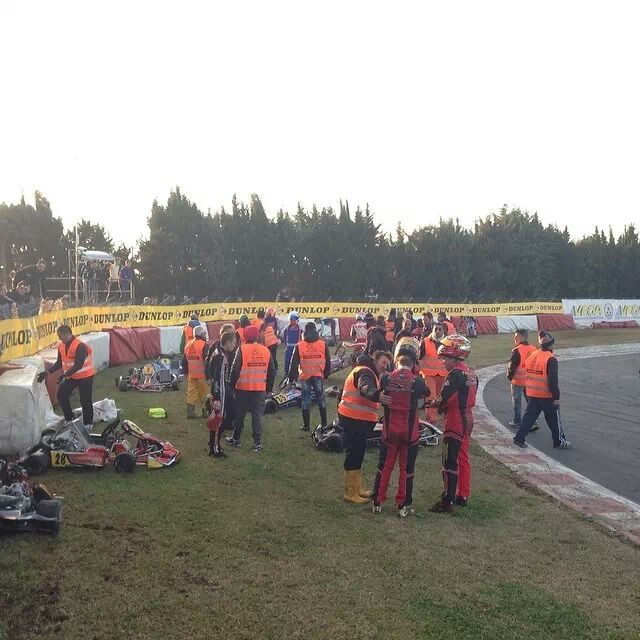 Als diese Gruppe in der Wiese bzw. Reifenstapel stand und die Fahrer gerade am aussteigen waren, kam die nächste Gruppe an, die in die bereits stehenden Karts/Fahrer flogen.