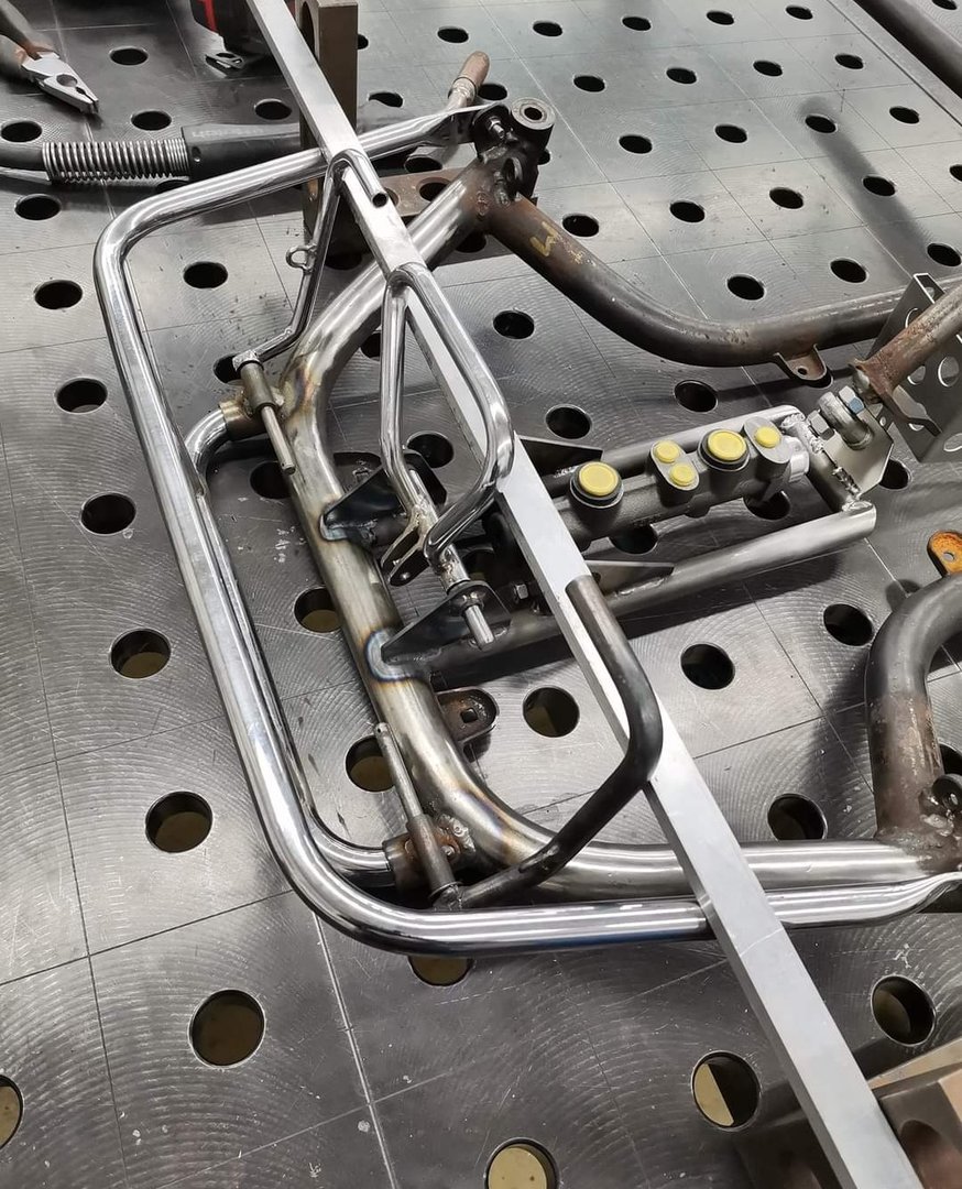 Der nächste Schritt ist gemacht. Bremspedal bekam eine Messing-Buchse und ist eingepasst, neue Aufnahmen für Gas und Kupplungspedal sind wieder dran. Das Kupplungspedal wurde geringfügig modifiziert, die Öse für den Bowdenzug war etwas zu tief. Die Aufnahme für das Lenksäulenlager unten ist fertig und auch die neue Stoßstange wurde von mehrteilig auf einteilig geändert.