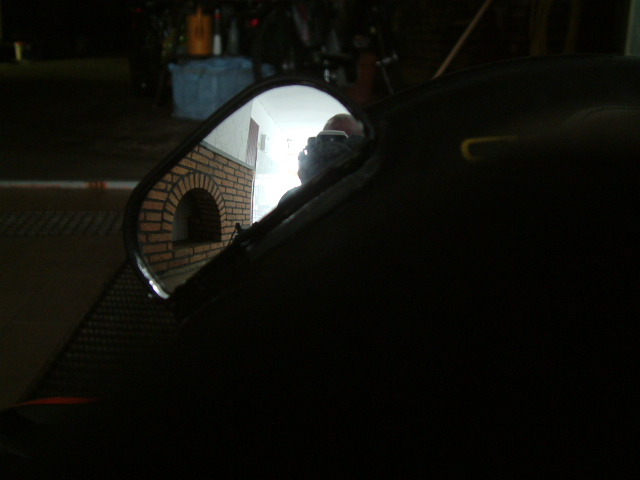 Spiegel am Frontschild nach einigen Versuchen in gezeigter Stellung angeheftet, Sitzprobe, nach gerichtet und dann mit Acryl verklebt.