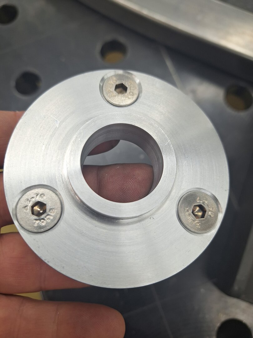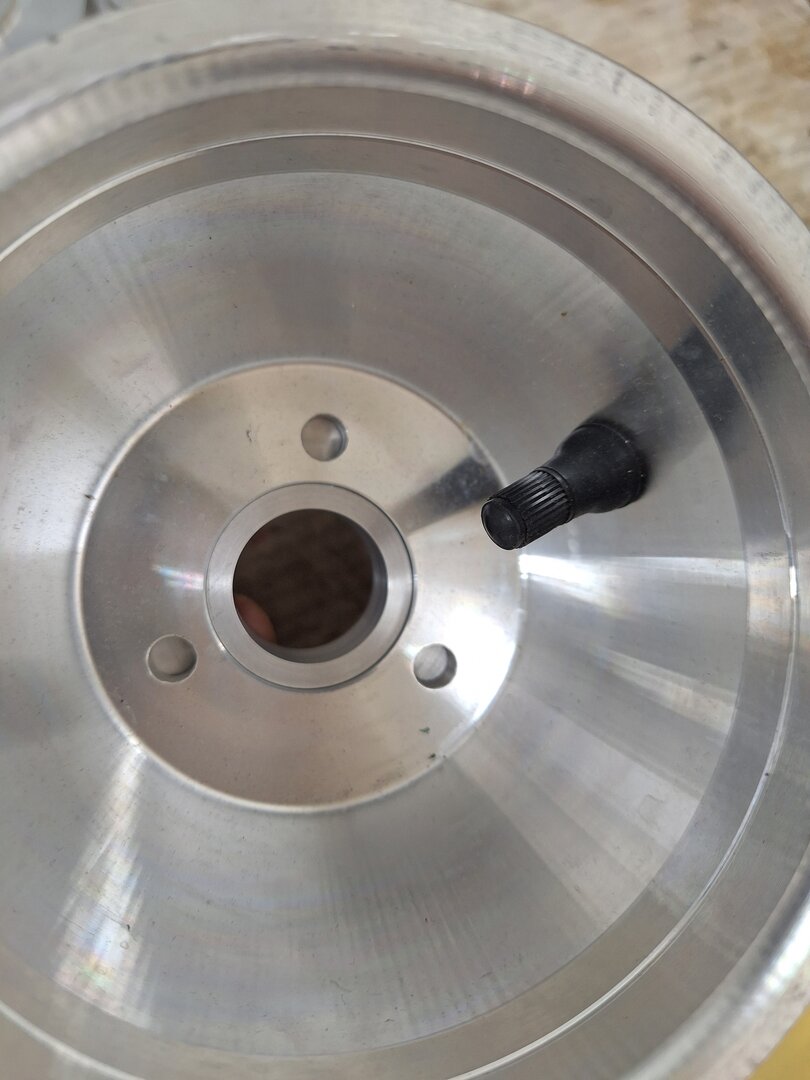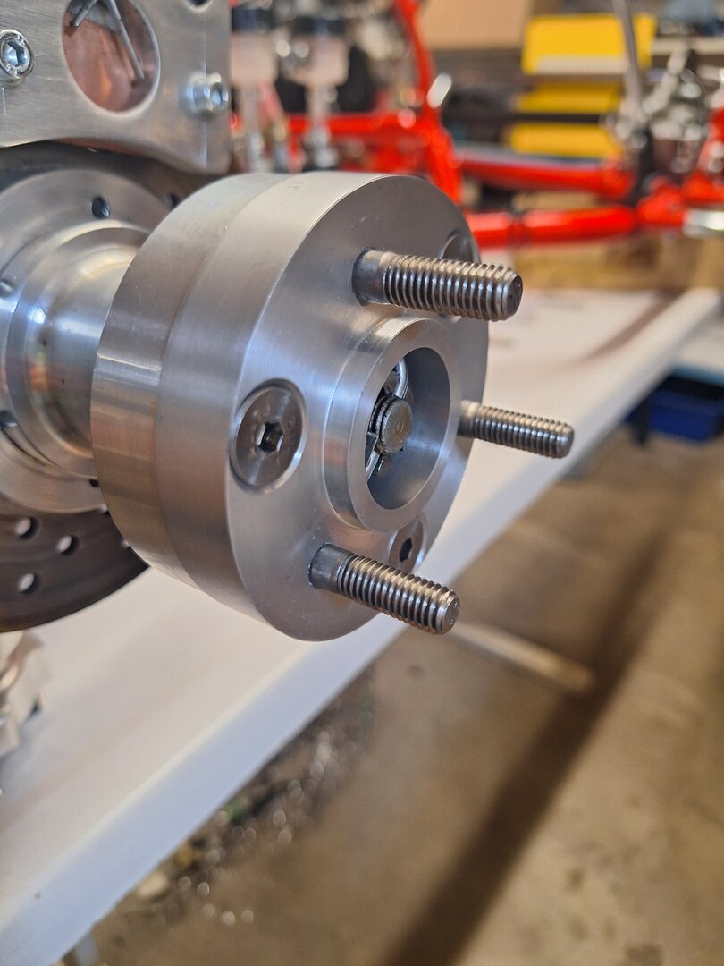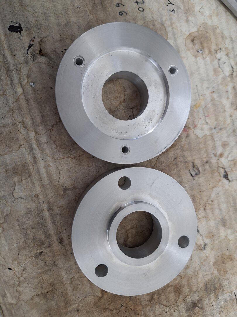 Gedreht aus dem Vollen, Standart 58mm Lochkreis und 40mm Mittenzentrierung. Das ganze dann auf dem Teilekopf der Fräsmaschine gebohrt, Gewinde rein geschnitten und mit 8er Bolzen versehen. Angeschraubt werden die Adapter mit Senkkopfschrauen, die eh unter der Felge verschwinden.