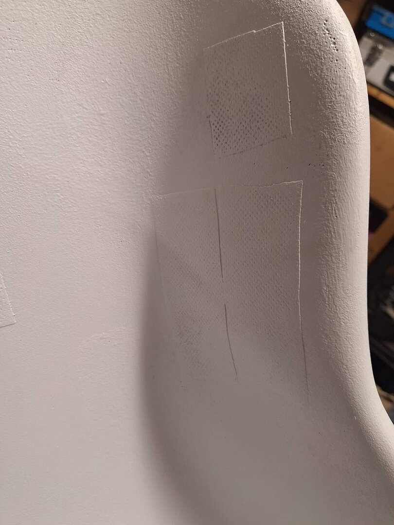 Der Zufall wollte es, das ich beim Strahler war und sah, daß die Jungs GFK strahlten...Geil, das erspart viel Schleifarbeit. Also fix die Schüssel gestrahlt und dann die Löcher wieder verschlossen. Die Pflaster innen werden noch verschliffen und fein gespachtelt, dann kriegt er Farbe.