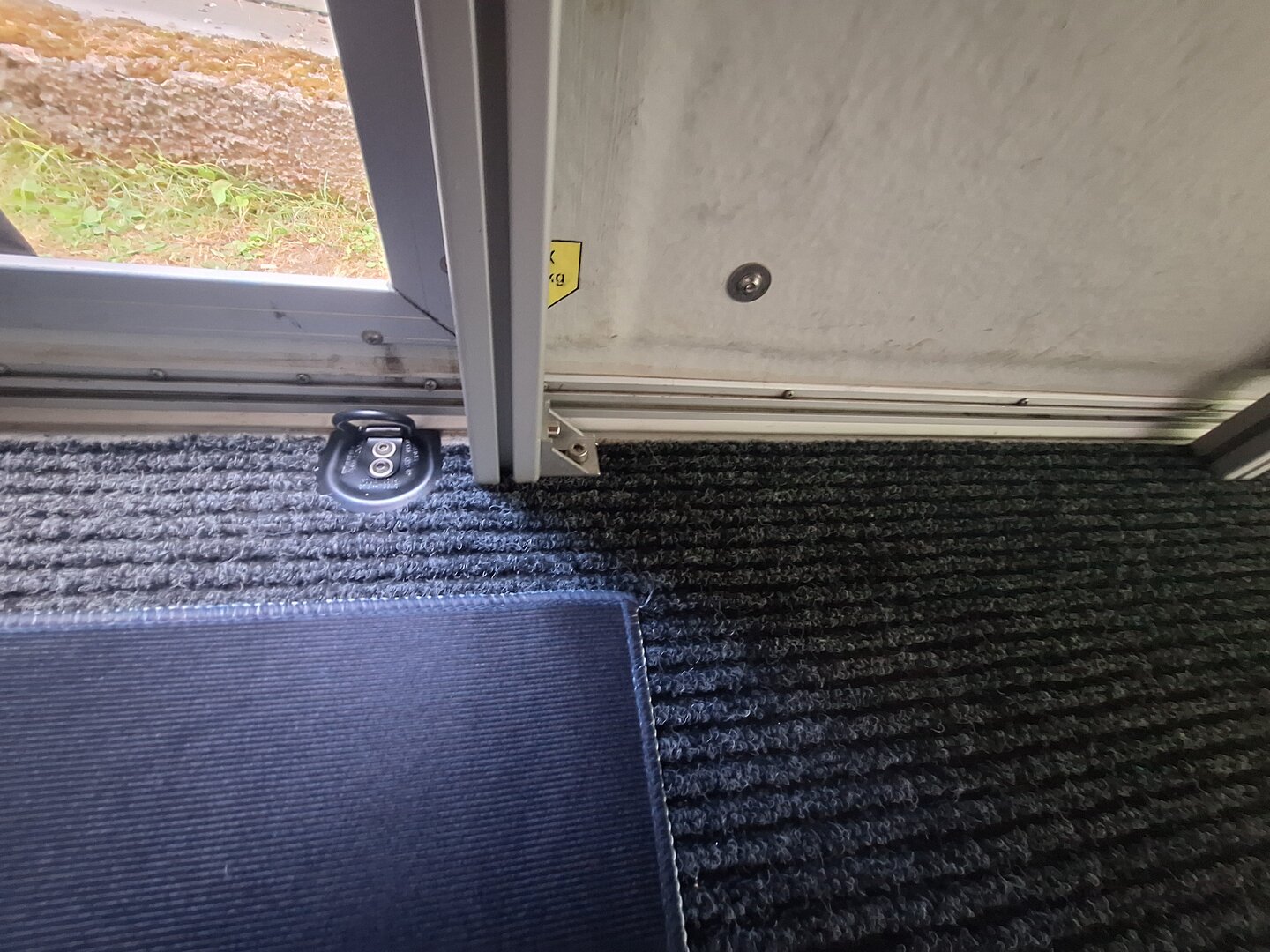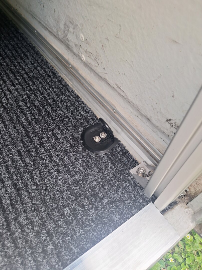 Die Füßstütze vom Gestell an der Tür habe ich auch nochmal nach hinten versetzt. Zum einen, das ich die ursprünglichen Löcher der Zurröse wieder nutzen konnte, zum anderen stieß die untere Türverriegelung dagegen und optisch siehts sowieso besser aus, als wenn da so'n Ständer halb in der Türe steht.