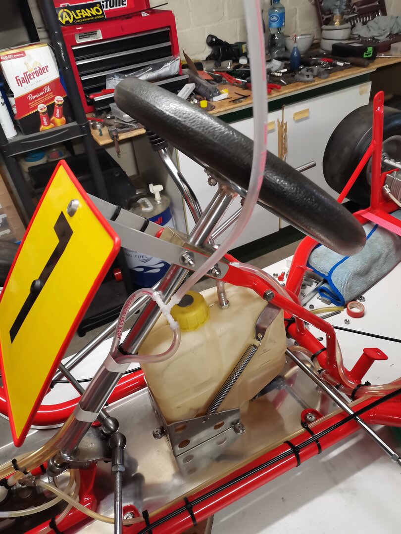 Die letzten Arbeiten sind abgeschlossen, der kleine 50ccm K-Wagen ist fertig. Die Bremse wurde befüllt und entlüftet und ein Probelauf war endlich auch erfolgreich. Nachdem ich das vorangegangene Wochenende vergeblich versucht habe, den Motor nach der Regenerierung zum laufen zu kriegen, aber mehr als massive Fehlzündungen nicht zustande kamen, hab ich versucht, den Fehler zu finden. Alles auseinander gebaut, nachgeschaut, wieder zusammen gebaut. Ohne Erfolg. Zweifel am eigenen Verstand kamen auf... Also den Motor runter gemacht, Karfreitag ins Auto gesprungen und mal just 300km gen Osten zu meinem Motoren-Spezialisten gekachelt. Mein erster Verdacht, das die alte Motoplat Zündung eventuell ne Macke hat, ließ sich dann auf dem Zündungsprüfstand ausschließen. Der Fehler war simpel. Dadurch das der Zylinder neu ist und scheinbar leicht anders ist, passte der Zündzeitpunkt nicht mehr. Zwar war die Zündung eigentlich nach den Markierungen ordentlich eingestellt, stand aber tatsächlich dann auf 3,5 nach OT...