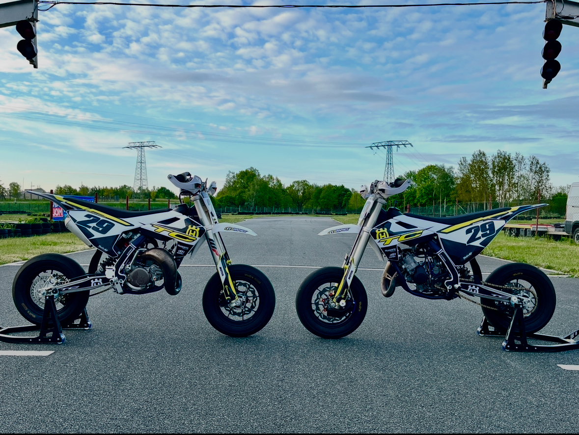 Aktuell habe ich 2 85er Husqvarna mit 105cc Factory KIT. Die Fahrwerke lasse ich in Italien überarbeiten und die speziellen Dreh- und Frästeile gebe ich Auftrag. Es sind keine orginären Pitbikes sondern eine Zwischenstufe. Sie fahren eher wie Motorräder und nicht so kippelig. Anbei mal ein Eindruck.