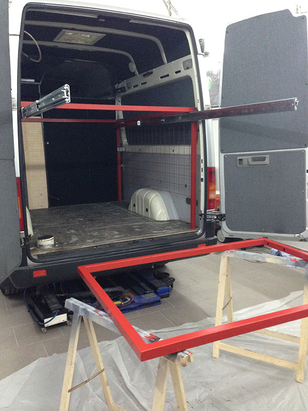Die Werkzeugkisten auf der Schiebetüre werden eventuell um 90° verdreht, damit der Einstieg einfacher ist (eventuell, muss ich mir noch vor Ort ansehen).