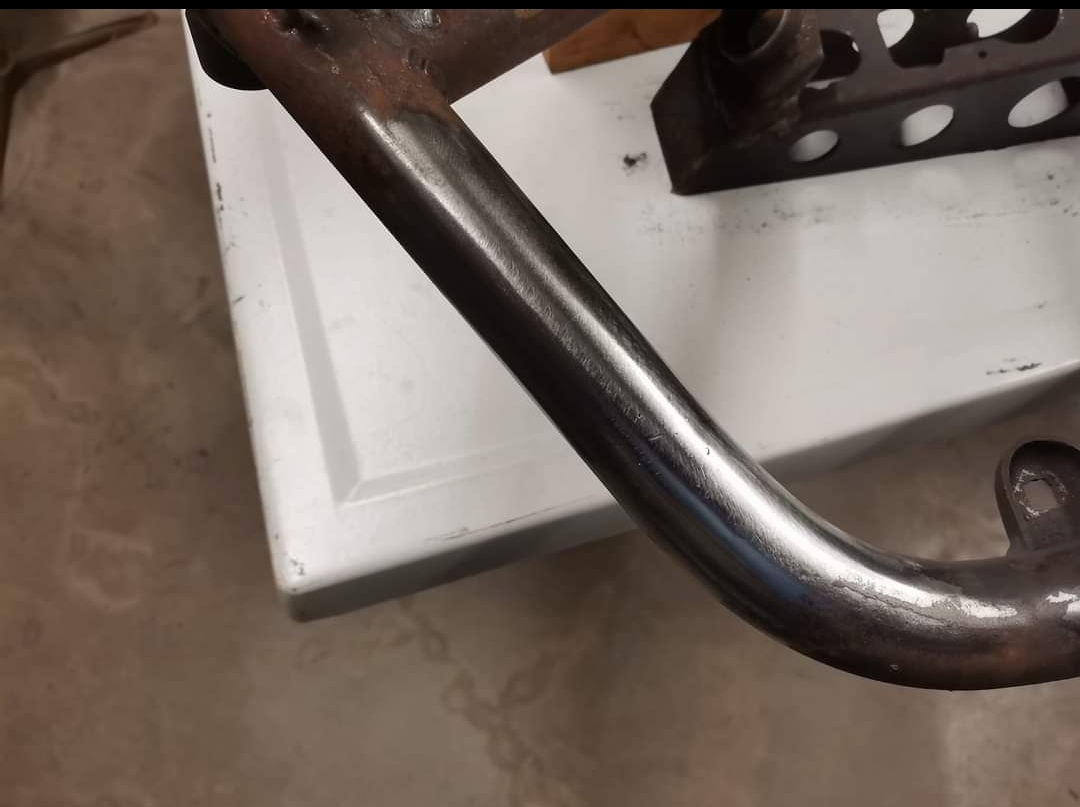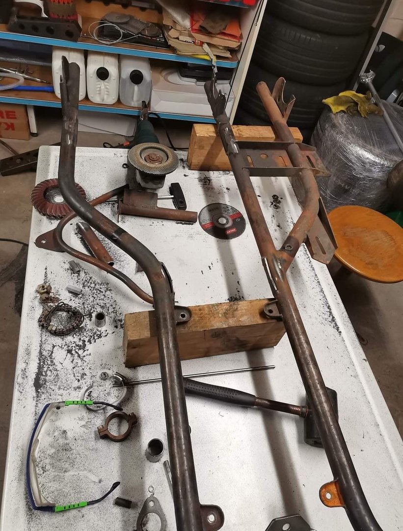 Entweder richtig, oder gar nicht... 3h exzessive Flex und Schleifarbeit. Wohl dem, wer auf vernünftiges Equipment von Metallbauern zurück greifen kann. Rohrschleifer und Elektro Feile machen die Arbeit um einiges angenehmer und Reste von Schweißnähten lassen sich super entfernen. Die alte Sitzaufnahme kam weg, das alte Schaltrohr und auch das Rahmenprofil, was Sitz und ehemals Batterie beherbergte, kam weg. Die alten Pedal Aufnahmen und die HBZ Aufnahme wandern ebenfalls in die Schrott Kiste und entstehen neu.