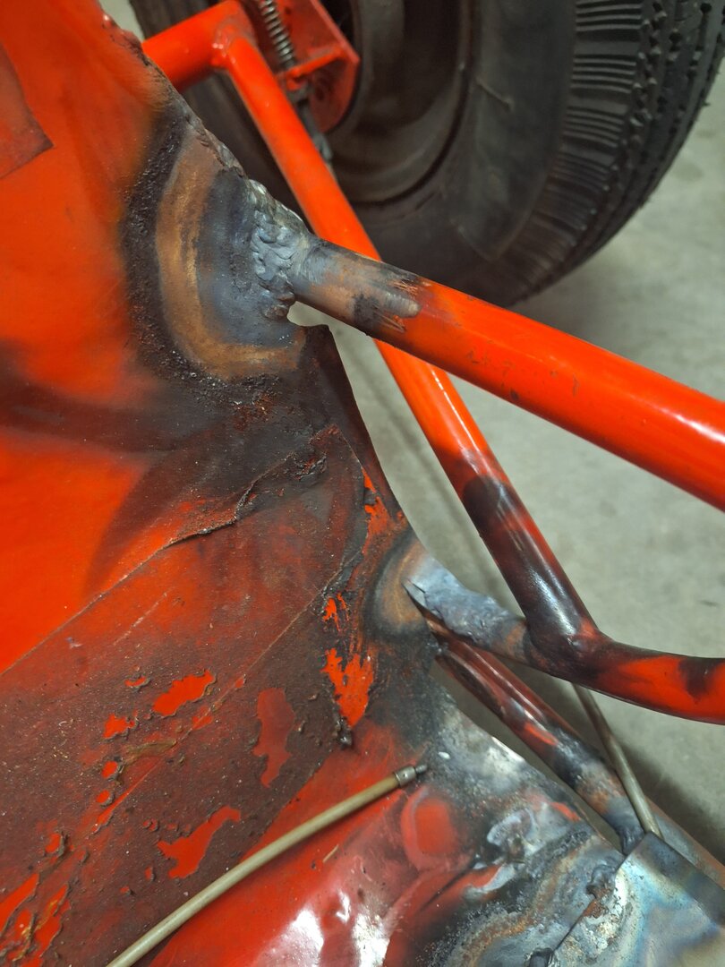 Nach stundenlanger Flex-und Schleifarbeit war der ganze Mist raus und der eigentliche Grundrahmen offenbarte weitere Schäden. Die Bremsseilaufnahme war nahezu durch gebrochen und eine Reparatur macht da keinen Sinn. Das kommt definitiv neu. Der alte Sitzbügel sollte eigentlich erhalten werden, aber auch da ist der Murks so groß, das ein Neubau die sinnvollere Alternative ist. Das alte Bodenblech war am Rahmen verschweißt und diente der diagonalen Stabilität. Da das neue aus Alu entsteht und schraubar sein wird, kommt unten ein zusätzliches Versteifungskreuz in den Rahmen. Das muss einfach sein, da der ganze Rahmen eigentlich mittlerweile viel zu fragil ist. Spätestens jetzt ist auch klar, das dieser Wagen nicht mehr im aktiven Renngeschehen eingesetzt wird, sondern als rollendes Museum weiter lebt. Fahrbar für zarte Demorunden ja, Renneinsatz nein. Macht mit Trommelbremsen auch nicht mehr wirklich Spaß.