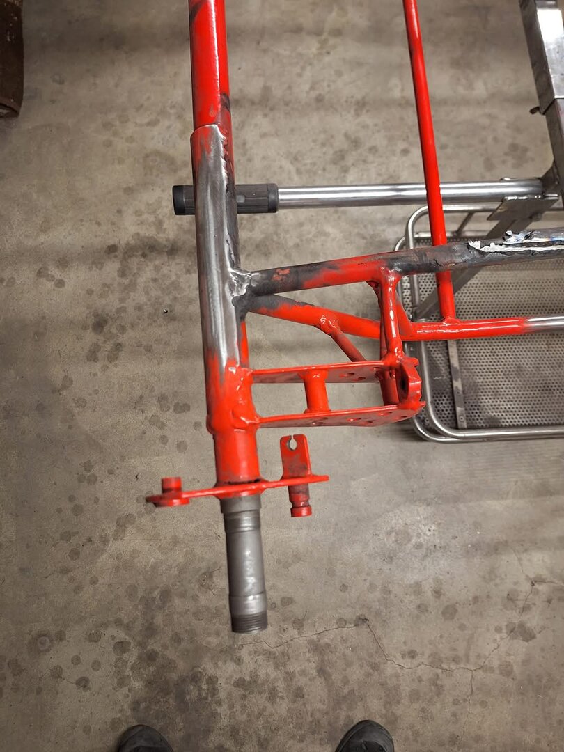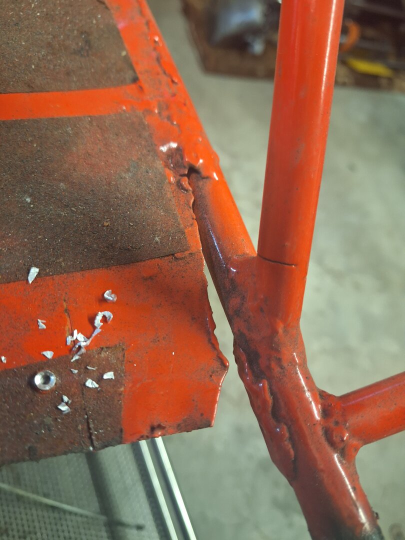 Alles raus was scheiße ist. Rückbau auf ursprüngliche Sitzkonstruktion und Motoraufhängung. Bodenblech raus. Zusatzrohre raus. Brüche reparieren (kommen nach dem Strahlen warscheinlich noch welche dazu). Rahmen richten...