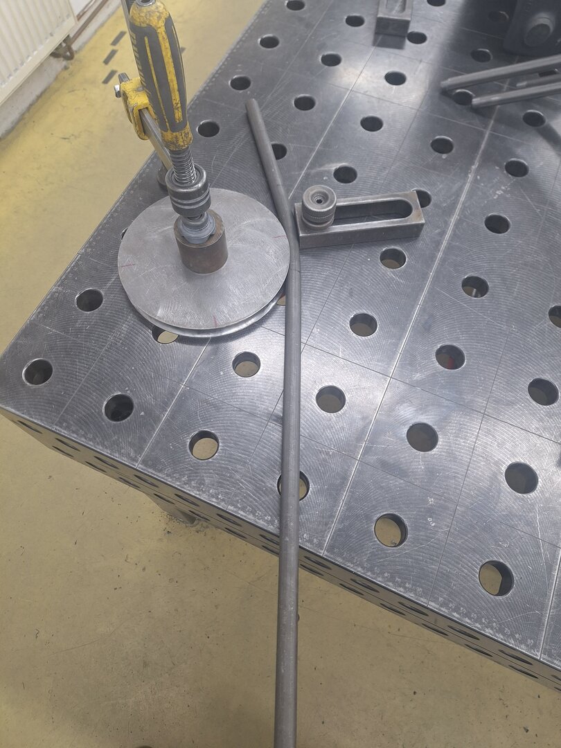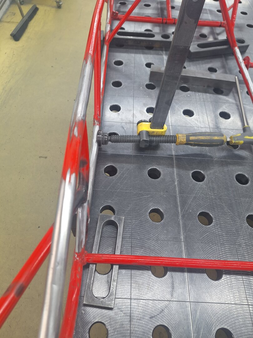 Weiter ging es nun nach dem ganzem Flex-und Schleifexzess mit den Richtarbeiten. Glücklicherweise verfüge ich über einen großen Schweißtisch, auf dem sich der Rahmen entsprechend fixieren und drücken lässt. Die Schweißtisch-Spanner erwiesen sich hierbei als super funktionierendes Richtwerkzeug. Obere und untere Rahmenrohre standen schief zueinander, geschuldet wohl auch den früheren, fehlenden Möglichkeiten bzw einer Rahmenlehre. Wurde ja alles nur frei Schnauze zusammen gefrickelt. Jedenfalls sind die Längsrohre "fahrerseits" wieder gerade und stehen ganz vernünftig übereinander. Auf der "Beifahrerseite" wird später noch etwas gerichtet, wenn der obere und untere Teilersatz der Rahmenrohre verschweißt ist.
