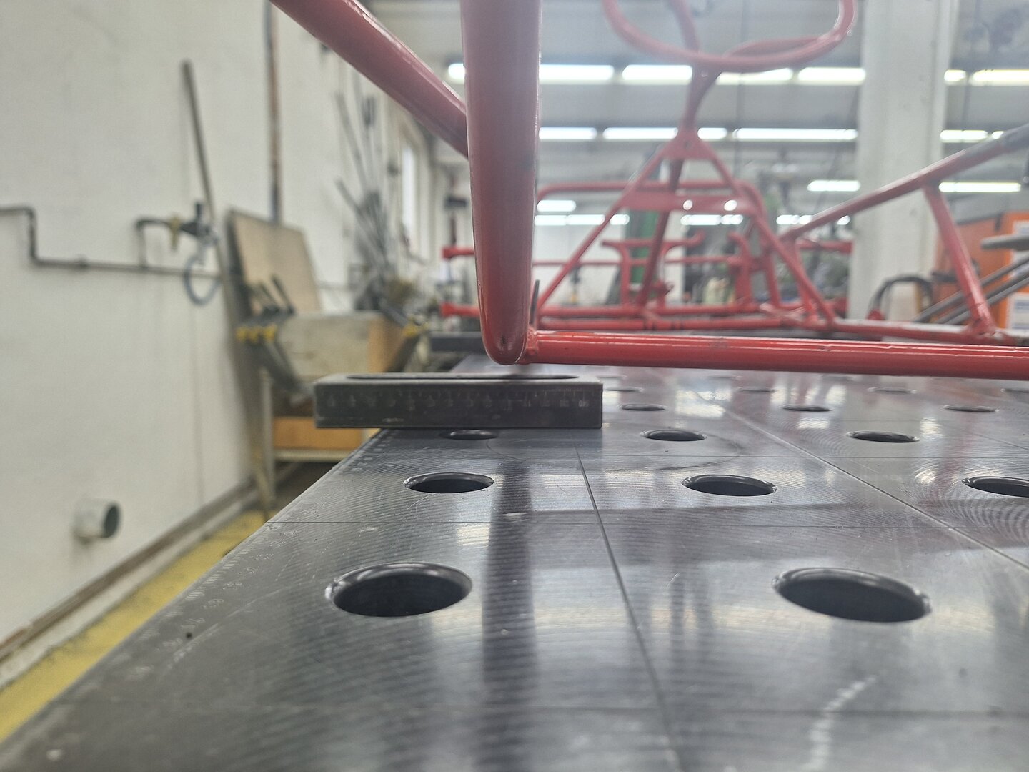 Als nächstes nehme ich den Rahmen auf die Richtplatte und schaue, wie krumm das ganze Ding wirklich ist. Die Hinterachse hat jedenfalls schonmal ordentlich Verzug und der Rhamen selbst ist in sich verdreht und kippelt.