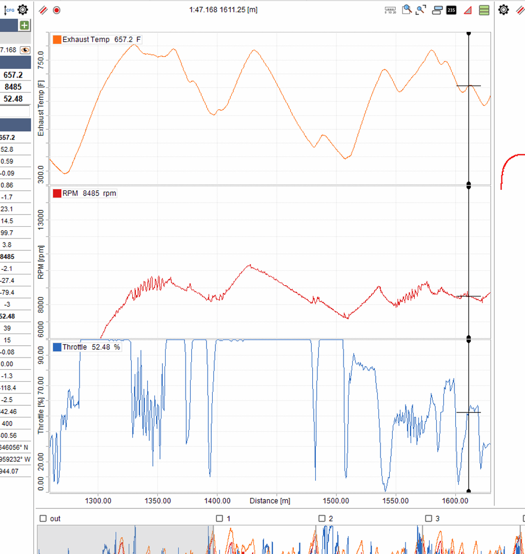 Ich habe einen Screenshot der Daten angehängt. Dies war mit der Hochdrehzahlnadel auf 1/2 Umdrehung offen, was eigentlich mager sein sollte. Aber man kann sehen, wie die Abgastemperatur oben ansteigt, dann bei Vollgas rapide abfällt, bis ich vom Gas gegangen bin.
