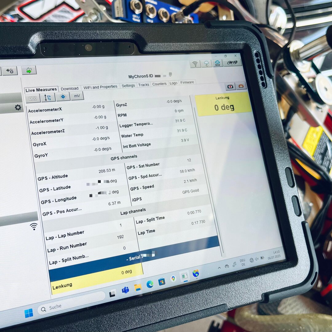 Einrichtung im MyChron5 war super einfach. MyChron5 einschalten, es macht ein automatisches Update und dann erscheint unter Einstellungen die Expansion, den Kanal auswählen, den Sensor Typ auswählen und anschliessend im RaceStudio3 oder direkt im MyChron5 den Sensor kalibrieren.