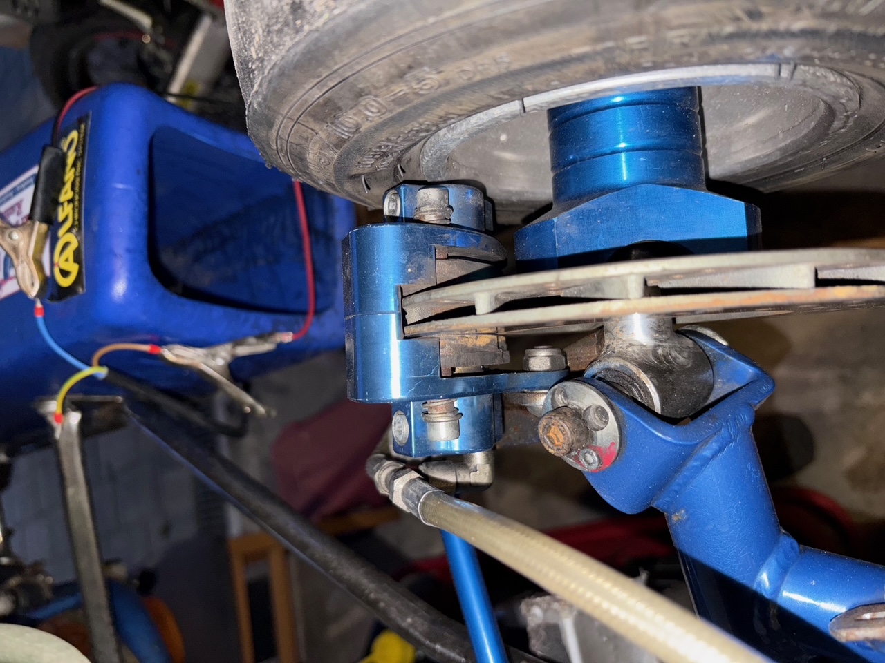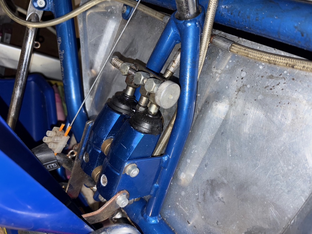 Unterhalb des Hauptbremszylinders und auch unterhalb der Bremszangen an den Radachsen ist es feucht. Ich glaube, dass sowohl an der Achse des Hauptbremszylinders, sowie an den Kolben der Bremszangen Bremsflüssigkeit austritt und Luft wieder eingesaugt wird.