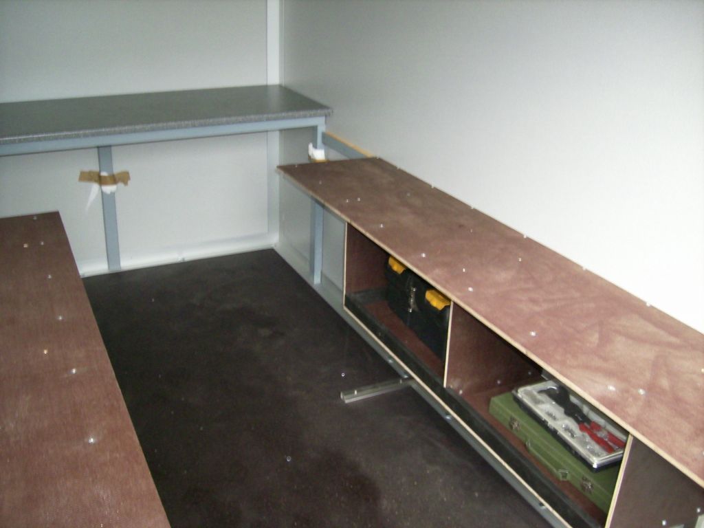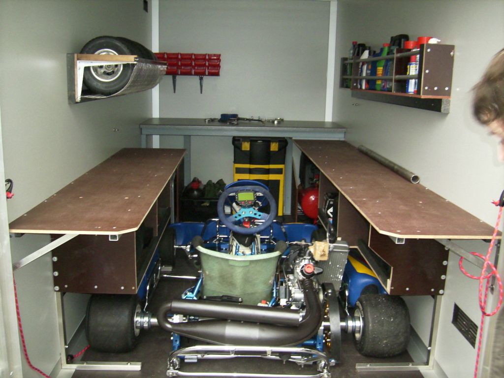 Vorgesehen ist der Anhänger zum Transport von 2 Karts (übereinander) sowie als fahrbare Werkstatt. Im vorderen Bereich befindet sich eine Arbeitsplatte (Schraubstock usw fehlen noch), wo man den Motor überholen kann usw.